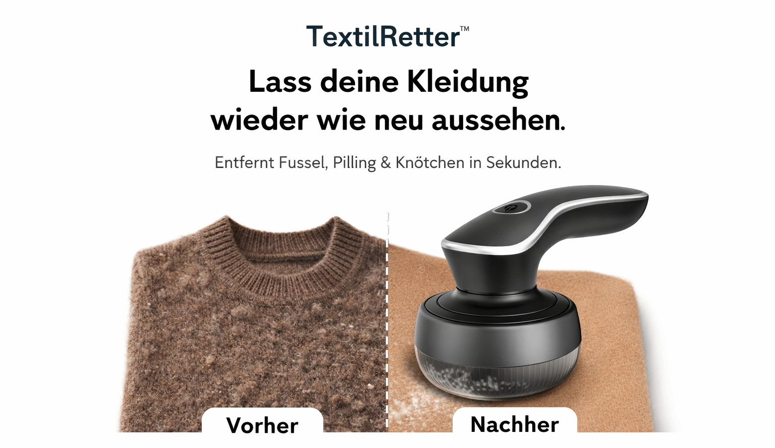 Entfernt Fussel, Pilling & Knötchen in Sekunden. Der TextilRetter™ ist dein neuer bester Freund für makellose Kleidung.